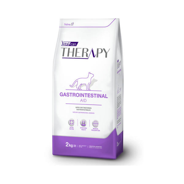 Vitalcan Therapy Feline Gastrointestinal Aid es un alimento de prescripción que contribuye al manejo nutricional del animal con síndrome de malabsorción, malasimilación, diarreas, vómitos, colitis, entre otros.